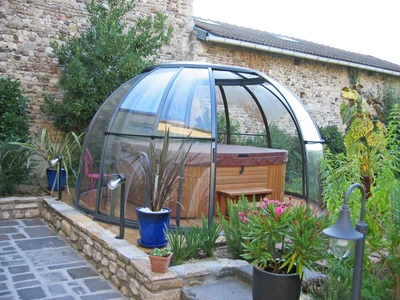 The AZURE™ Angle pool enclosure is the lowest model in the AZURE range, combining an arched roof with slanted walls. Its modern design fits any garden and includes compact polycarbonate panels with UV protection. Available in silver or anthracite, height ranges from 0.59 to 0.85 m.