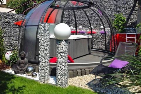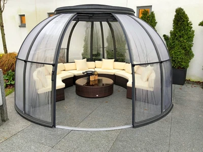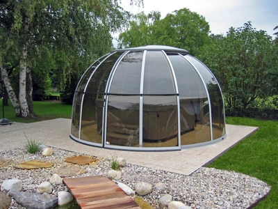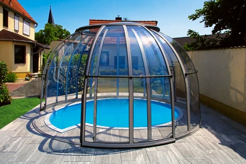 The AZURE™ pool enclosure is a medium-height solution with an elegant design, using a single radius of aluminium profiles. It offers a choice of infill between single-chamber or compact polycarbonate and is available in silver or anthracite colour.