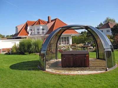 The VIVA™ pool enclosure by Alukov is a low-profile solution with a single-track system, allowing barrier-free access from three sides. This modern design protects the pool from dirt, speeds up water heating and maintains temperature overnight.