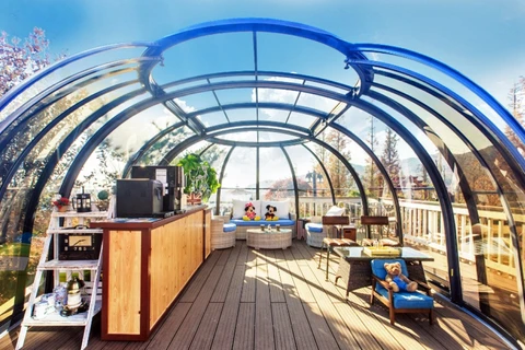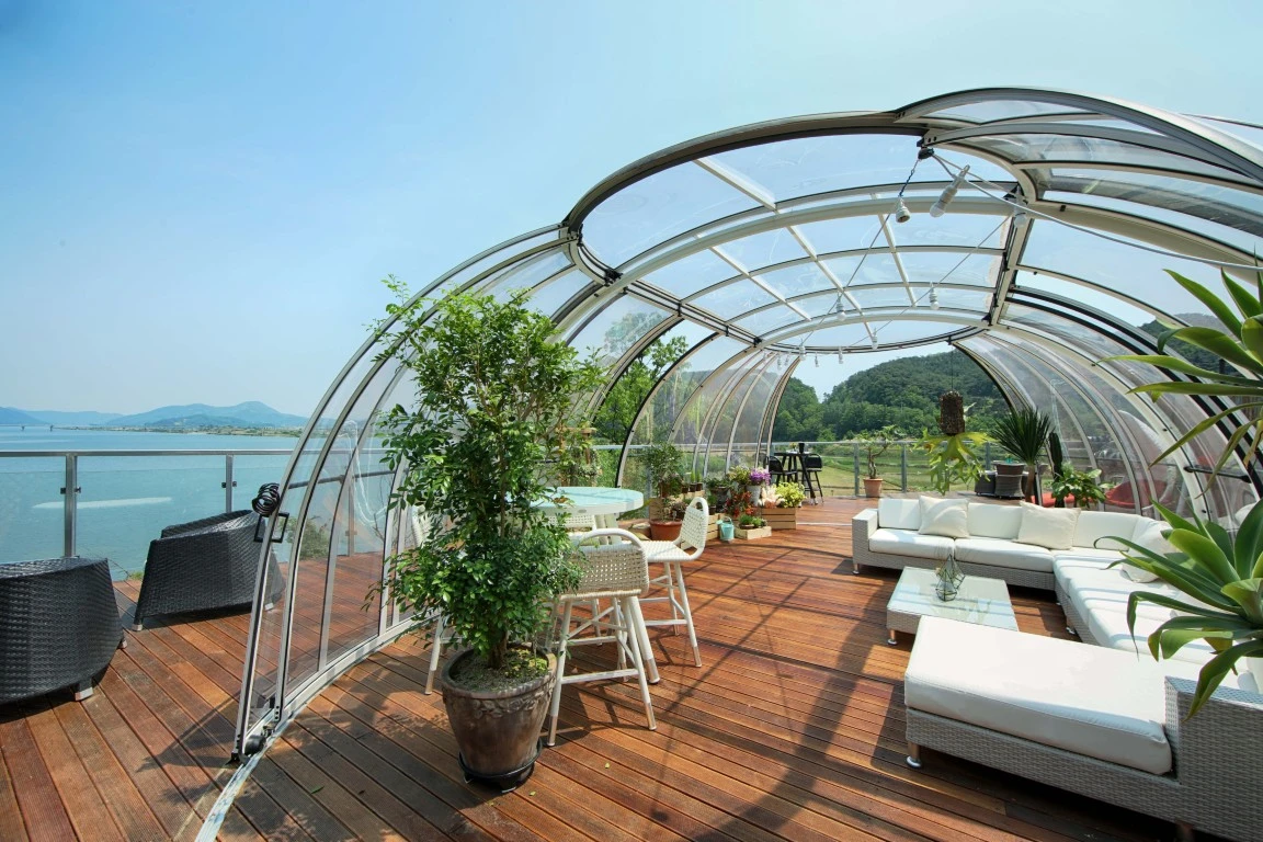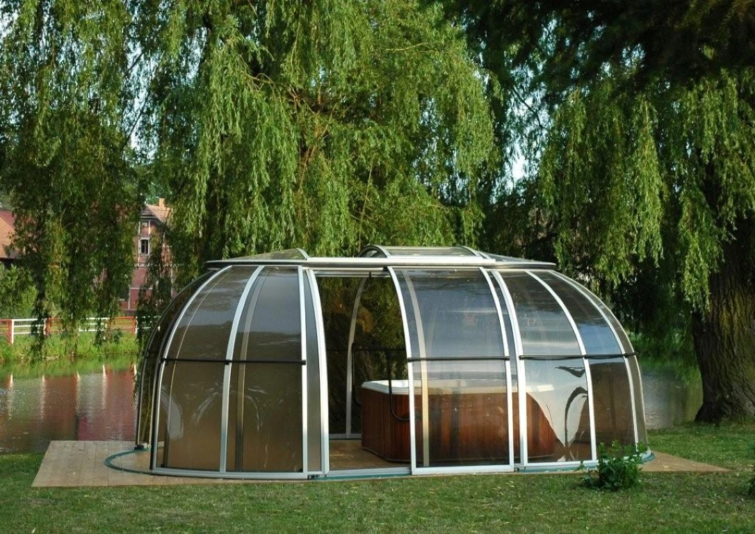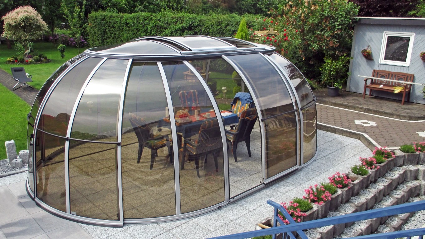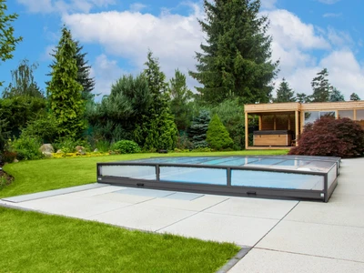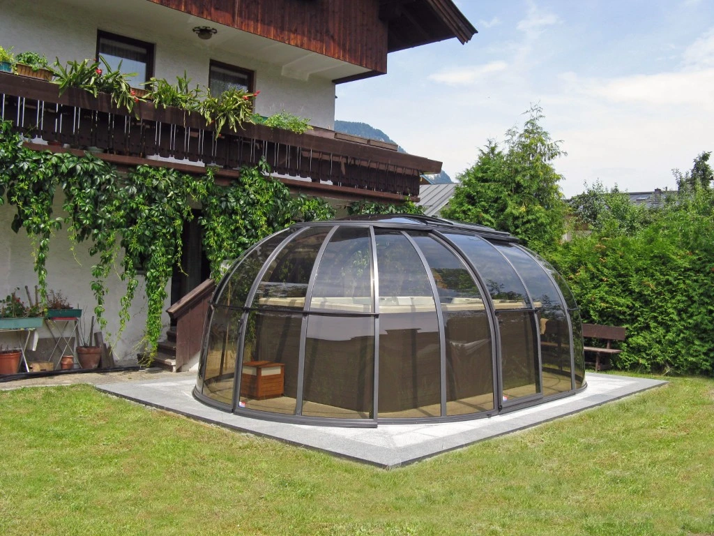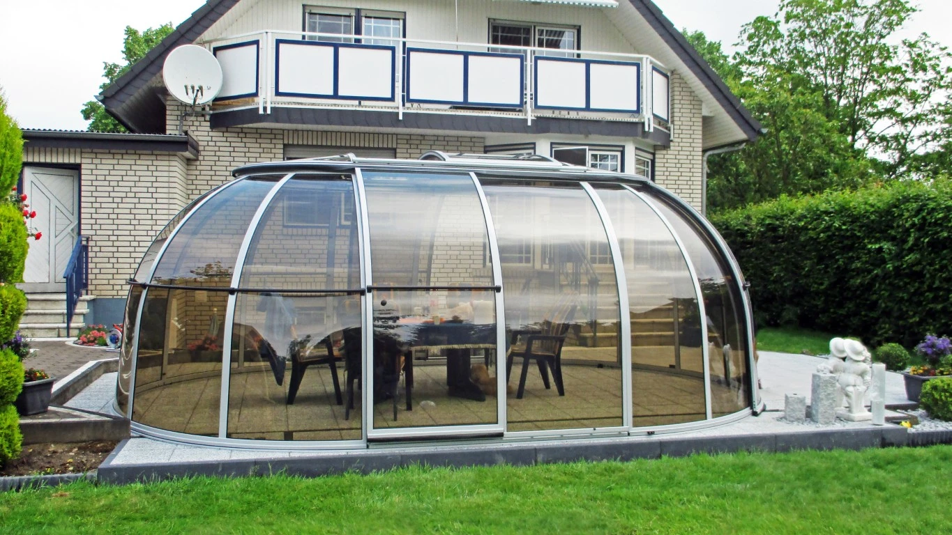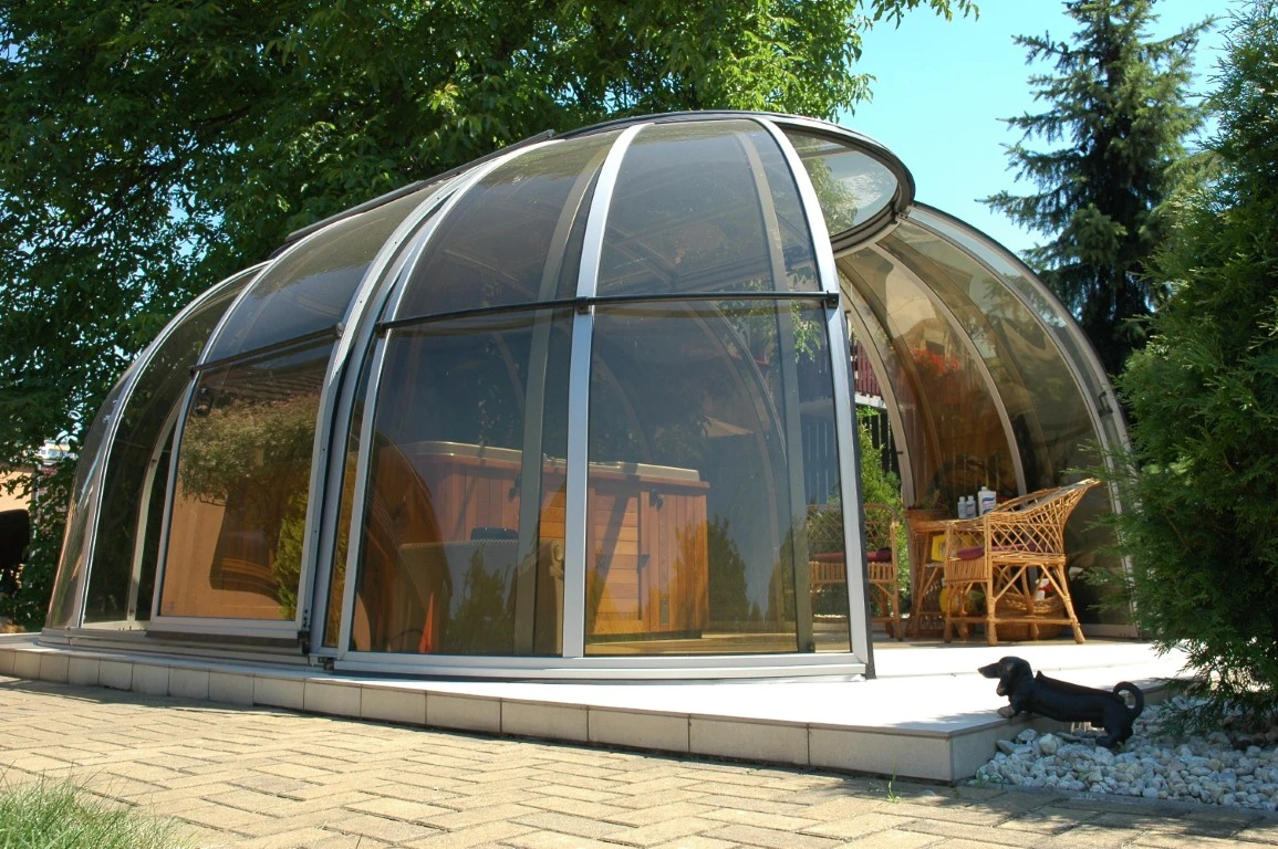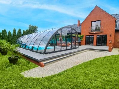 The VIVA™ pool enclosure by Alukov is a low-profile solution with a single-track system, allowing barrier-free access from three sides. This modern design protects the pool from dirt, speeds up water heating and maintains temperature overnight.
