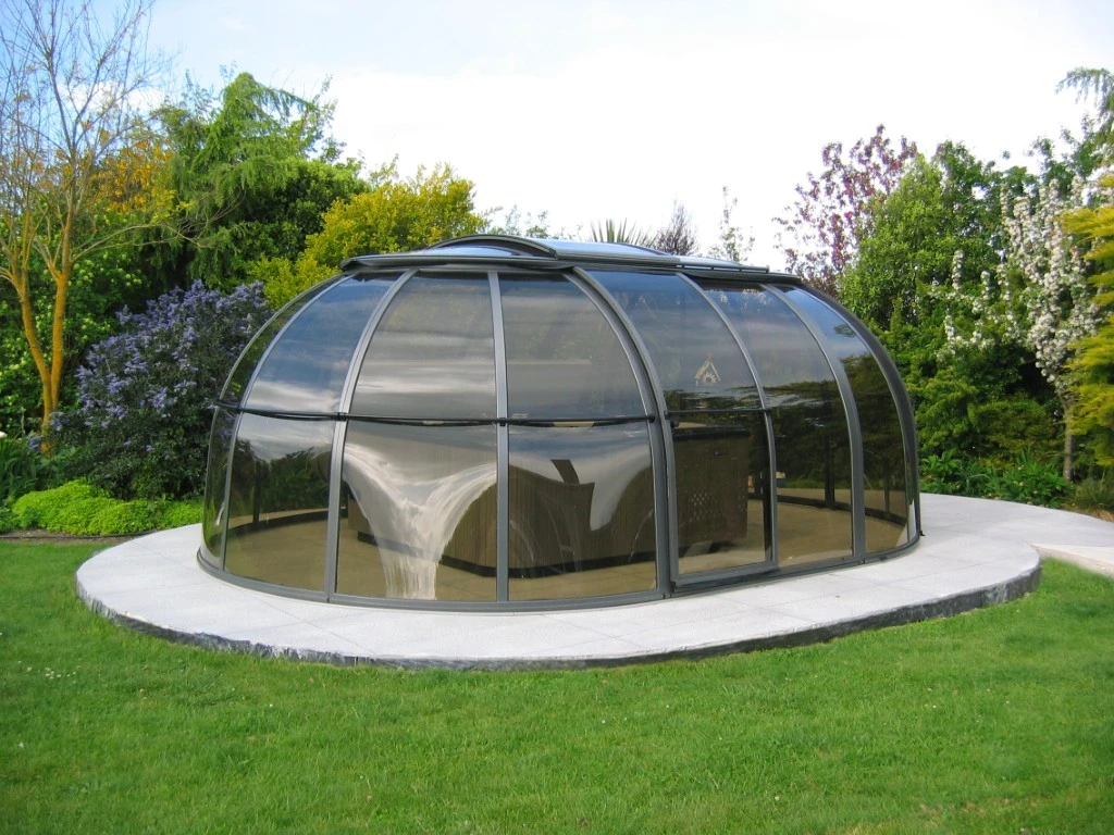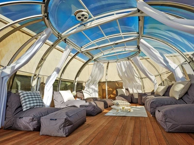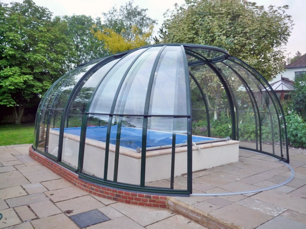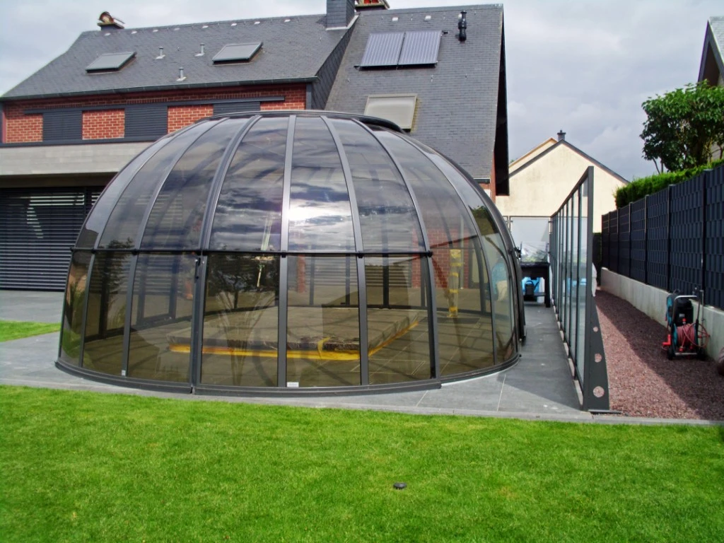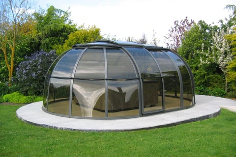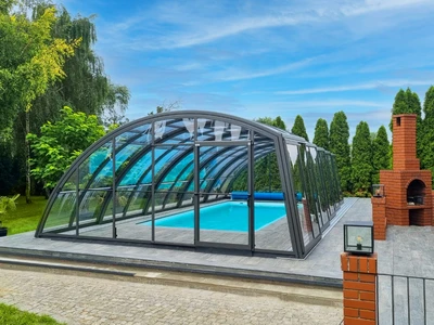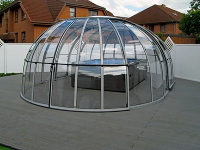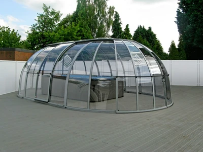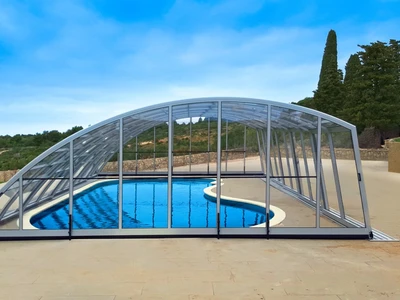 The AZURE™ pool enclosure is a medium-height solution with an elegant design, using a single radius of aluminium profiles. It offers a choice of infill between single-chamber or compact polycarbonate and is available in silver or anthracite colour.