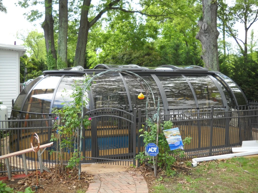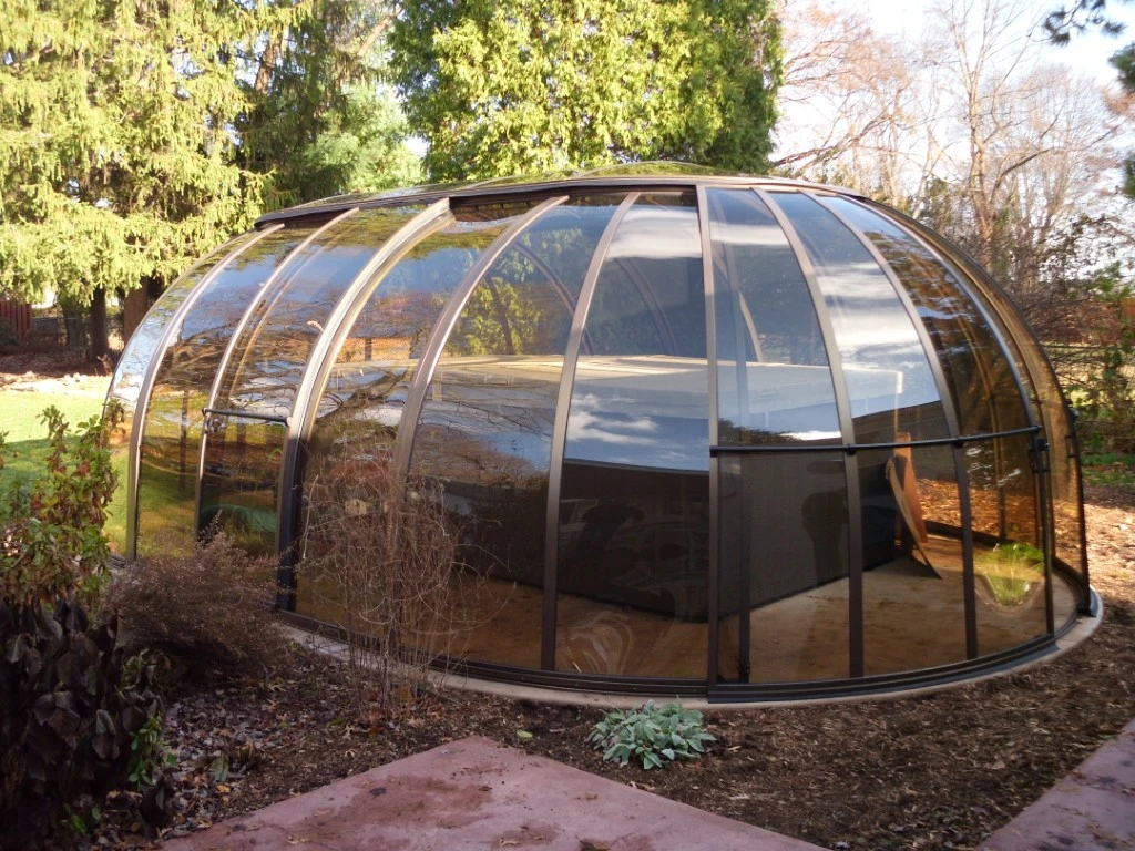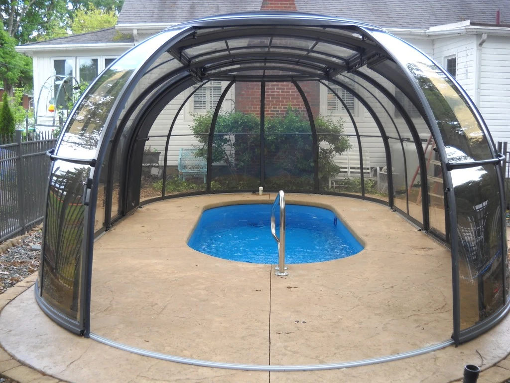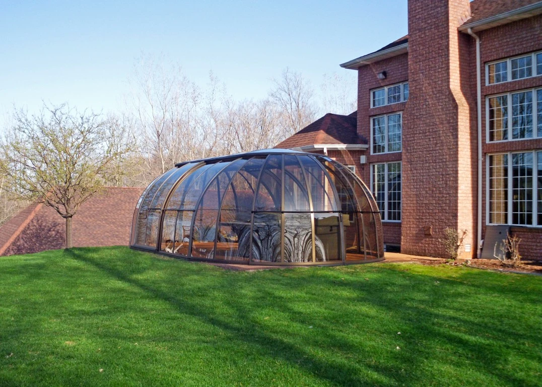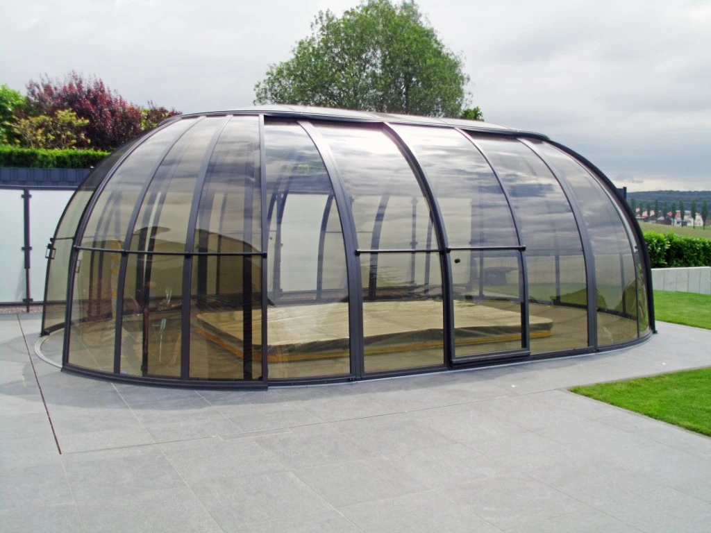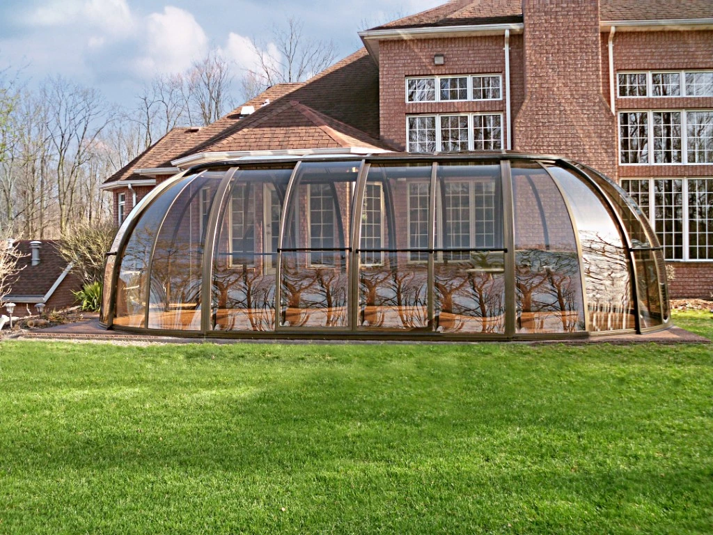 The RAVENA™ pool enclosure combines vertical walls with arched segments, allowing unobstructed movement around three sides of the pool. This modern design is ideal for pools located next to buildings or walls.