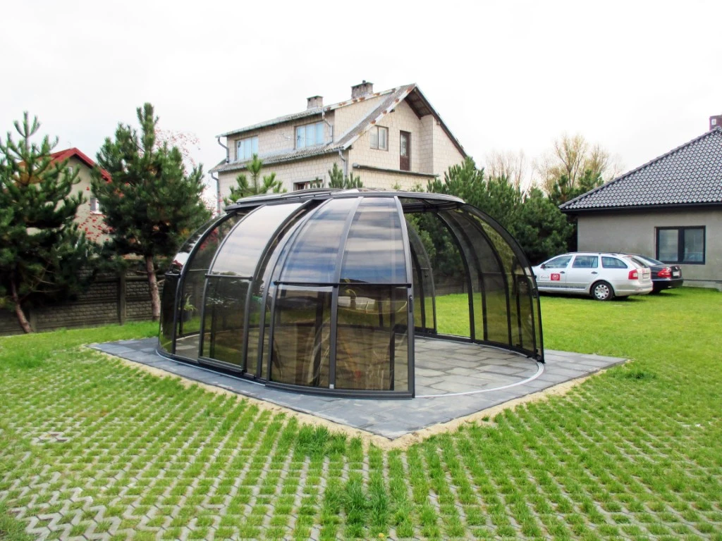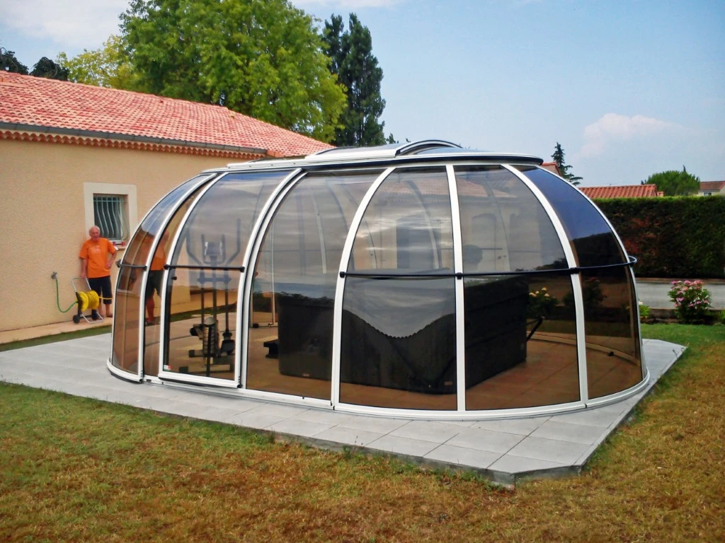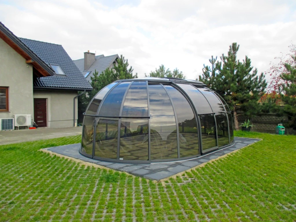 The AZURE™ Angle pool enclosure is the lowest model in the AZURE range, combining an arched roof with slanted walls. Its modern design fits any garden and includes compact polycarbonate panels with UV protection. Available in silver or anthracite, height ranges from 0.59 to 0.85 m.