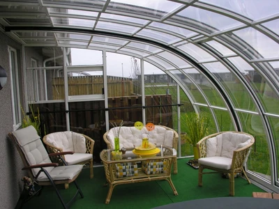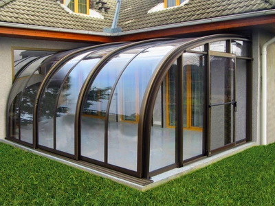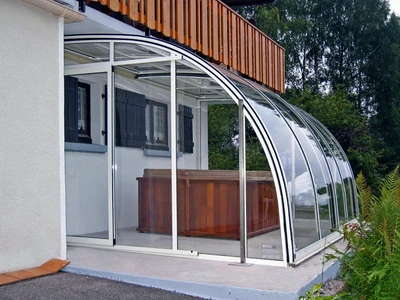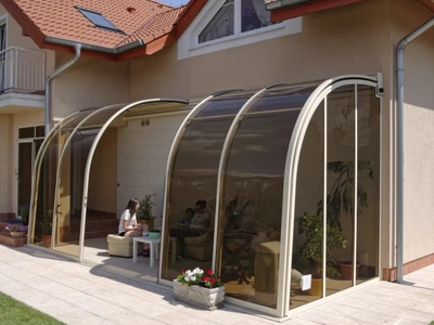 The luxury sliding terrace enclosure CORSO Premium by Alukov combines an aluminum structure, polycarbonate roof and CONNEX 33.1 safety glass. The elegant design and panoramic view provide year-round comfort and smooth handling.
