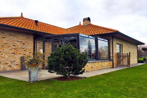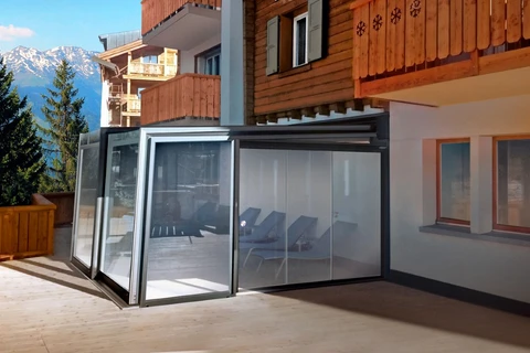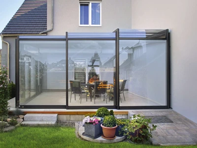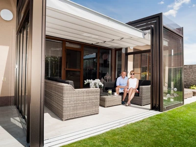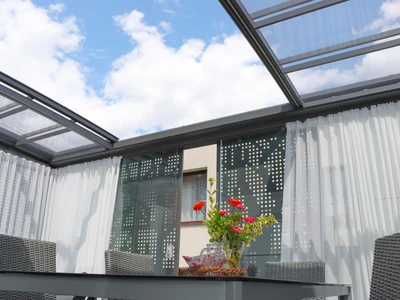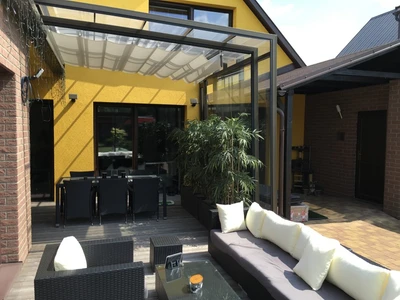 The luxury sliding terrace enclosure CORSO Premium by Alukov combines an aluminum structure, polycarbonate roof and CONNEX 33.1 safety glass. The elegant design and panoramic view provide year-round comfort and smooth handling.