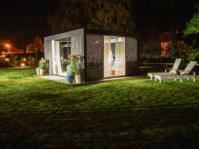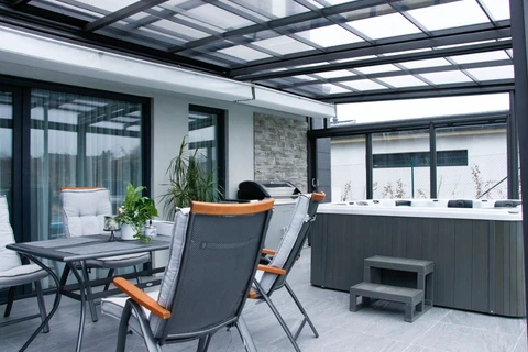 Pergola SPA by Alukov is a luxurious multifunctional pergola with a transparent openable roof, integrated shading and remote control. It offers comfort, protection and style for year-round use of your garden, terrace or relaxation zone.