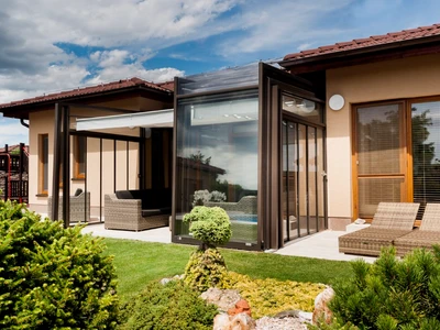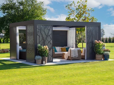 Pergola Venti by Alukov is an intelligent bioclimatic pergola of the new generation with a sliding roof, shading and side blinds. It offers year-round comfort, light and temperature regulation, and elegant design for modern outdoor living.