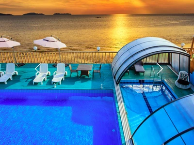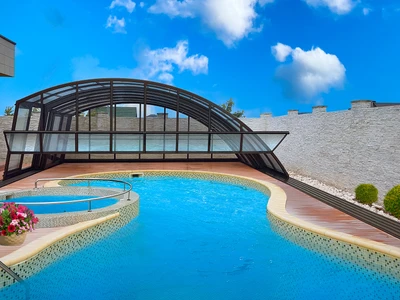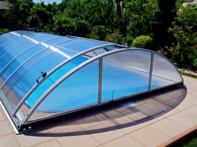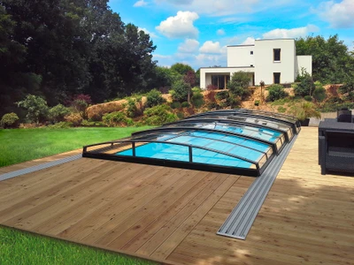 The VIVA™ pool enclosure by Alukov is a low-profile solution with a single-track system, allowing barrier-free access from three sides. This modern design protects the pool from dirt, speeds up water heating and maintains temperature overnight.
