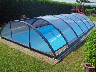 The AZURE™ Angle pool enclosure is the lowest model in the AZURE range, combining an arched roof with slanted walls. Its modern design fits any garden and includes compact polycarbonate panels with UV protection. Available in silver or anthracite, height ranges from 0.59 to 0.85 m.