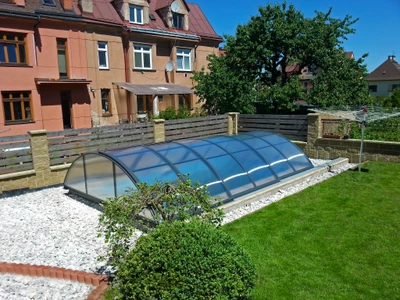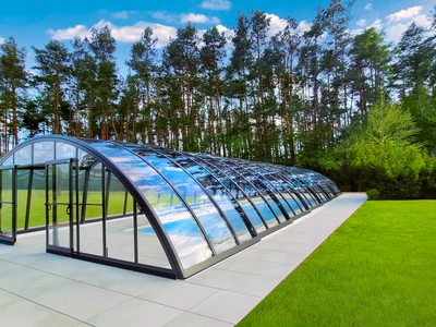 The AZURE™ pool enclosure is a medium-height solution with an elegant design, using a single radius of aluminium profiles. It offers a choice of infill between single-chamber or compact polycarbonate and is available in silver or anthracite colour.