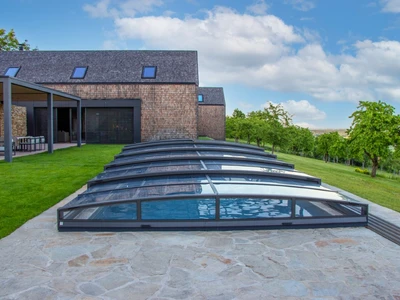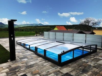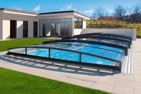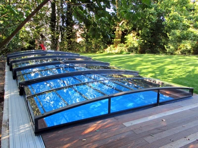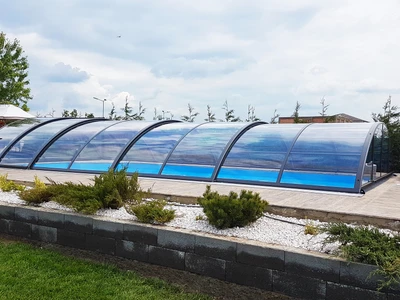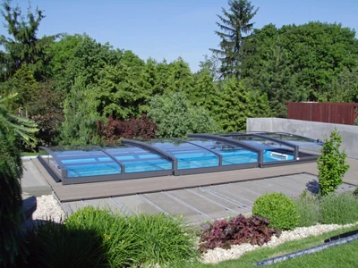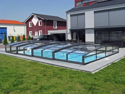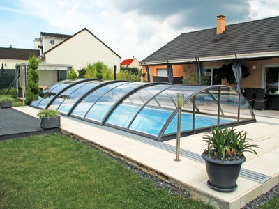 The AZURE Flat pool enclosure is a low-profile solution with an elegant design that harmoniously fits into modern gardens thanks to its multi-radius concept. It features a single-wall polycarbonate fill and a frame in silver or anthracite color.