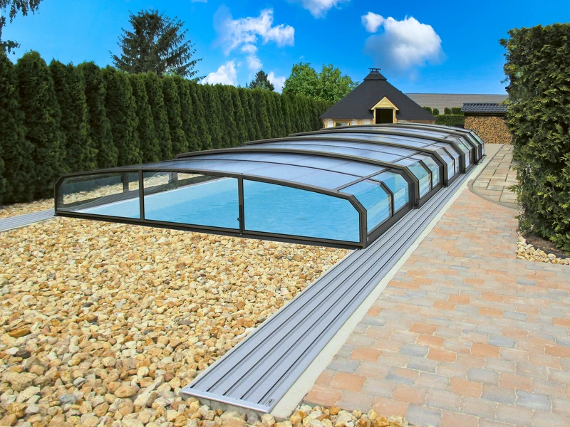 Pool & Spa Enclosures offers a wide range of low enclosure models designed with a focus on modern design, user-friendly operation, and long-lasting durability. Each model allows for smooth segment sliding, ensuring easy access to the pool without the need to uncover the entire structure. Thanks to high-quality materials such as clear or cellular polycarbonate and anodized aluminum profiles, these enclosures offer strong resistance to weather conditions and UV radiation. A low pool enclosure provides comfort and protection without disrupting the garden view or surrounding architecture.