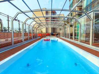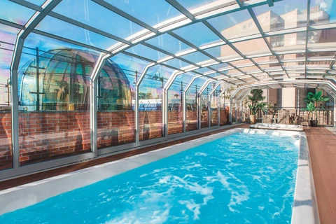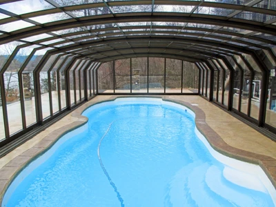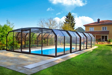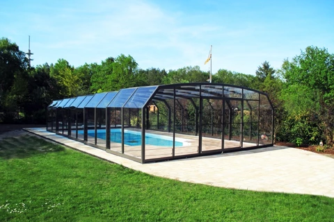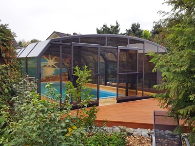 The VIVA™ pool enclosure by Alukov is a low-profile solution with a single-track system, allowing barrier-free access from three sides. This modern design protects the pool from dirt, speeds up water heating and maintains temperature overnight.