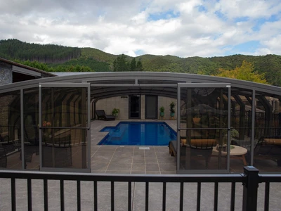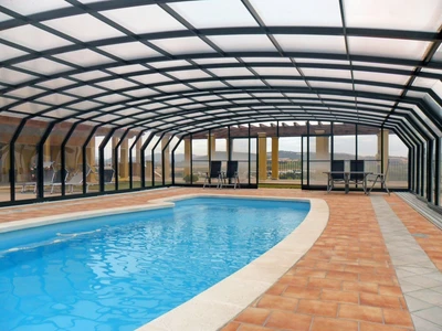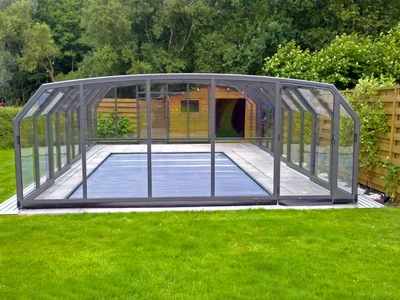 The AZURE™ pool enclosure is a medium-height solution with an elegant design, using a single radius of aluminium profiles. It offers a choice of infill between single-chamber or compact polycarbonate and is available in silver or anthracite colour.