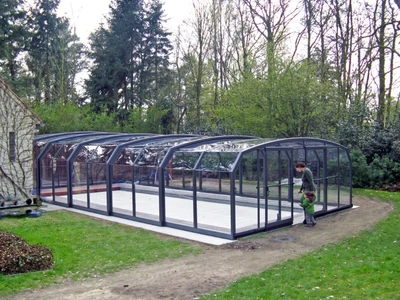 The AZURE™ Angle pool enclosure is the lowest model in the AZURE range, combining an arched roof with slanted walls. Its modern design fits any garden and includes compact polycarbonate panels with UV protection. Available in silver or anthracite, height ranges from 0.59 to 0.85 m.