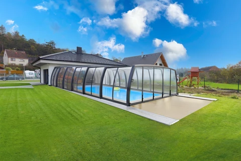 The OMEGA™ enclosure is ideal for pool owners looking for a spacious and visually attractive solution. The fully walkable space around the entire pool perimeter allows free movement and comfortable use of the area. Thanks to its curved walls, the enclosure appears visually lower, which preserves the overall garden appearance. High-quality materials and customizable color options ensure long service life and harmonious integration into various outdoor settings.