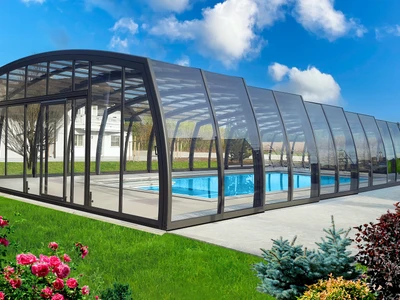 The OMEGA™ pool enclosure represents an innovative solution for pool owners looking for a spacious and aesthetically attractive cover. Its distinctive shape, resembling the Greek letter omega, is achieved by curving the walls outward, creating a positive spatial effect. This design causes the enclosure to appear optically lower than it actually is, while providing fully walkable space along the walls.