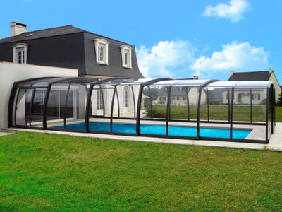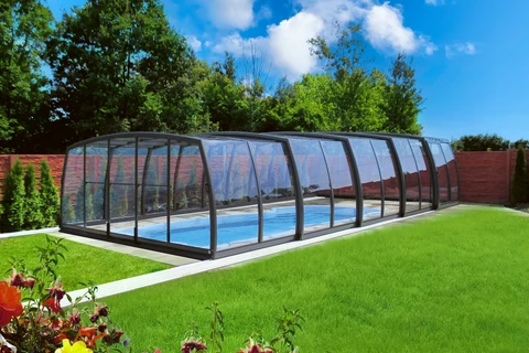 The OMEGA™ pool enclosure by Alukov features a unique design reminiscent of the Greek letter omega. Its arched side walls create a fully walkable space around the pool while preserving garden aesthetics.